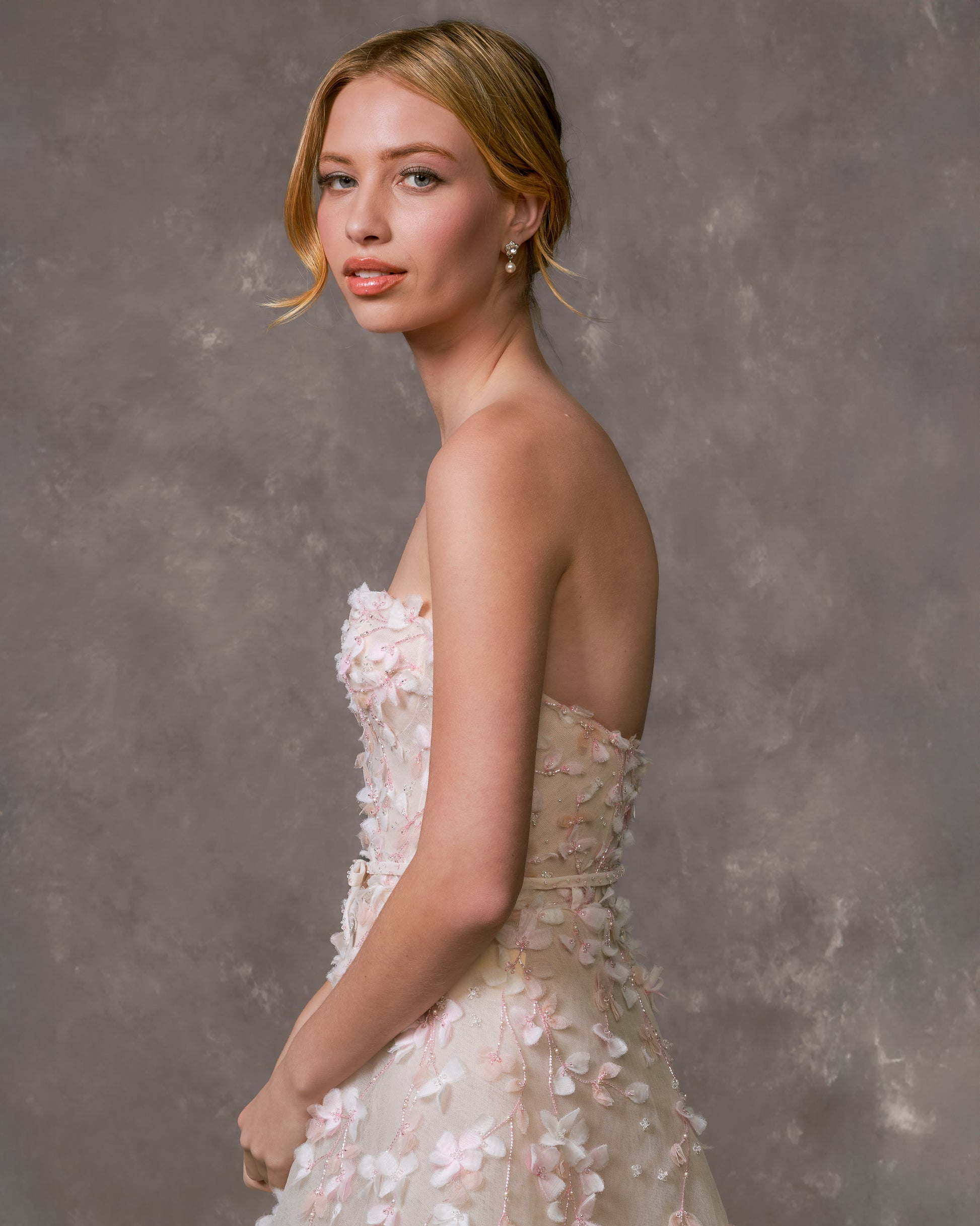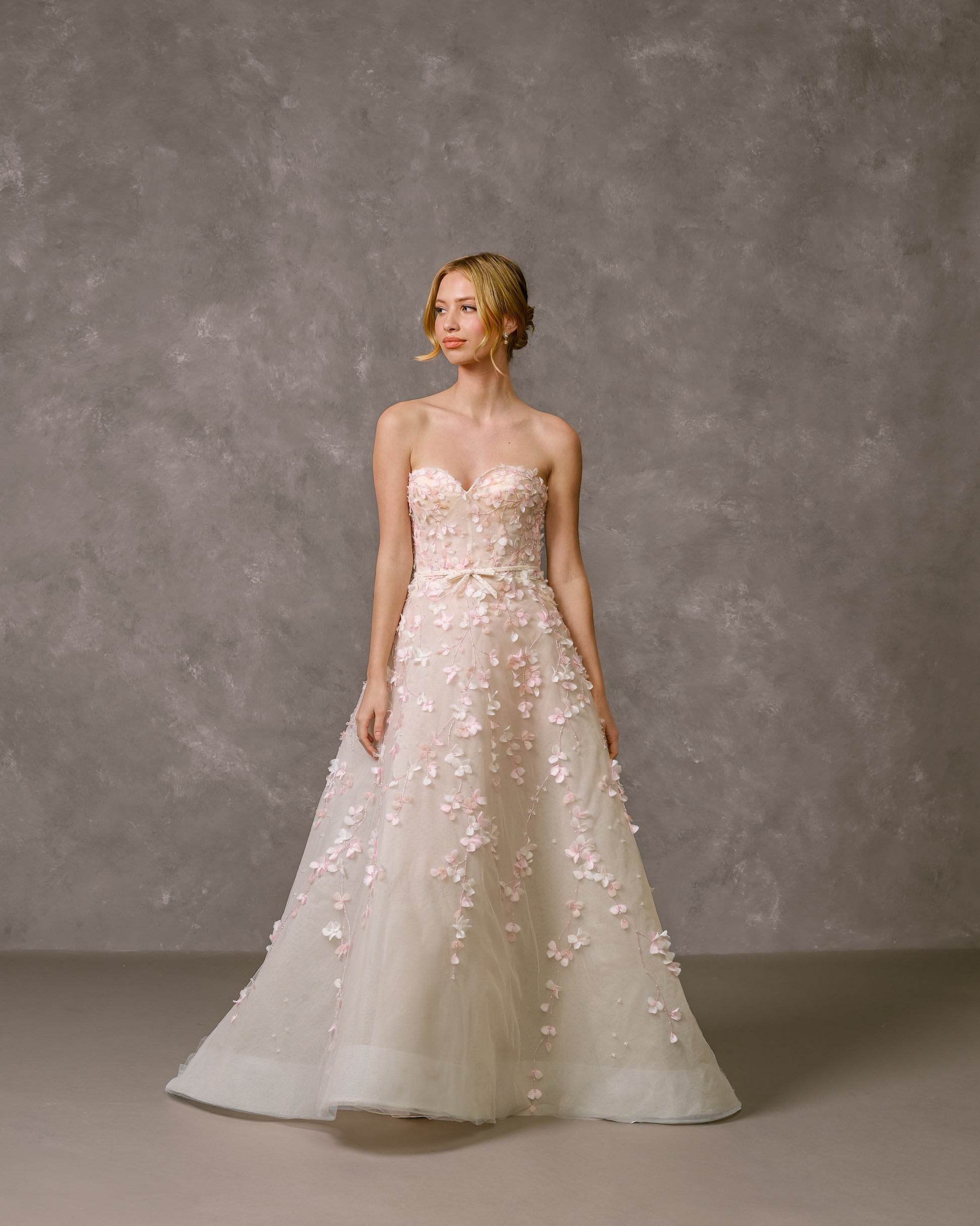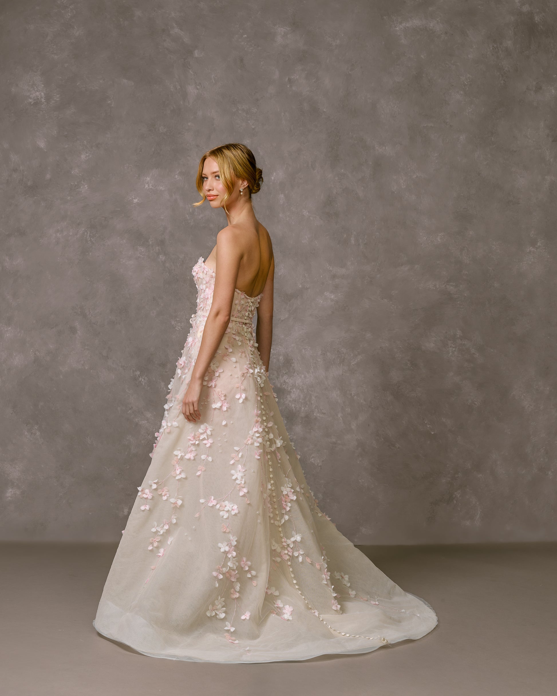 Petale captures the essence of spring in bloom. Crafted from airy layers of ivory tulle, the gown features a soft sweetheart neckline and a corset-style bodice that flatters with ease. Dimensional petals in blush and ivory are delicately scattered across the A-line silhouette, creating a sense of natural movement and texture. Feminine, expressive, and effortlessly romantic, Petale is a gown that blossoms with every step.
