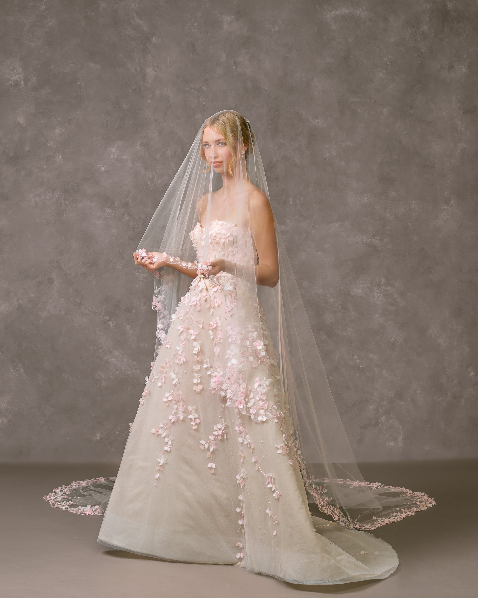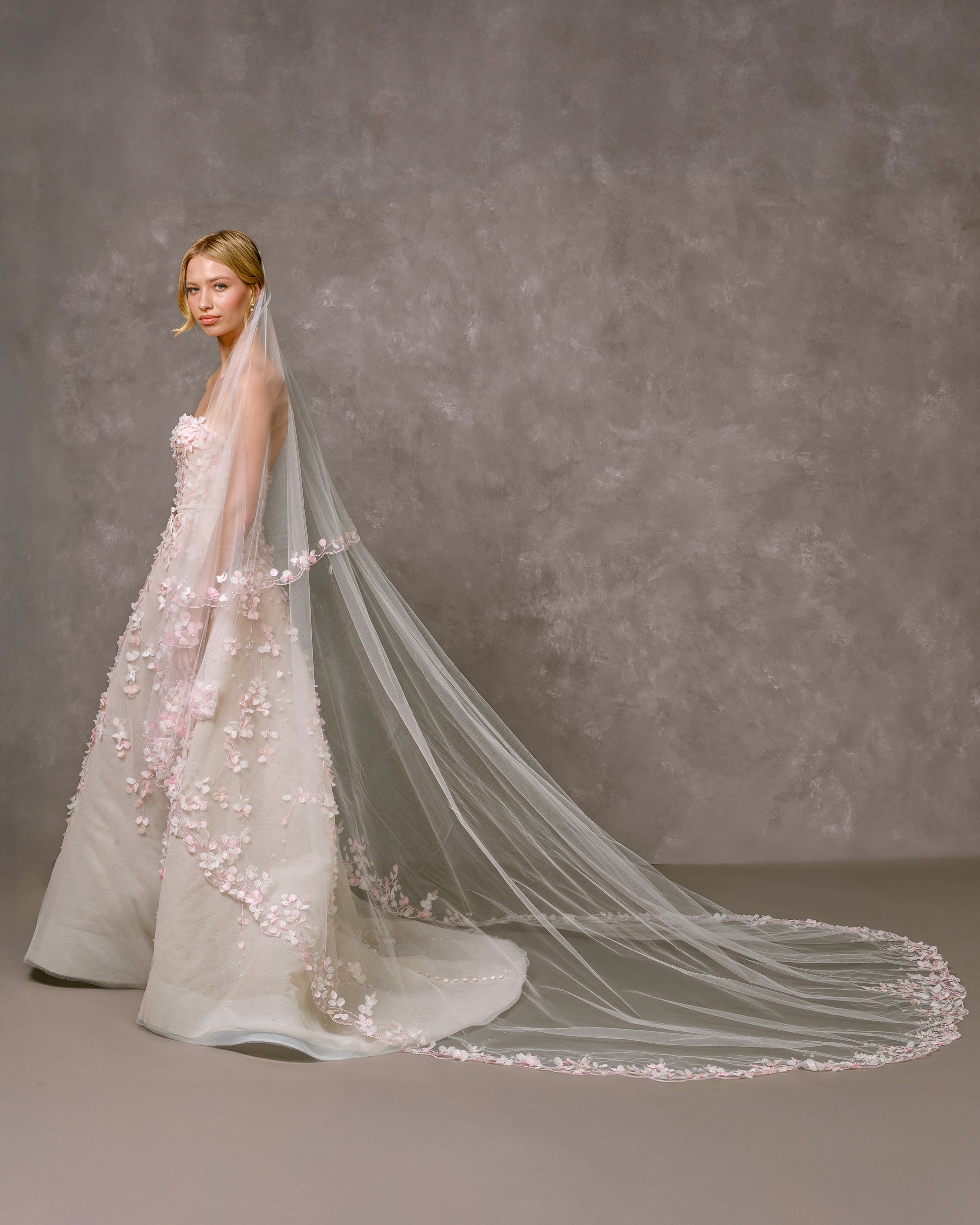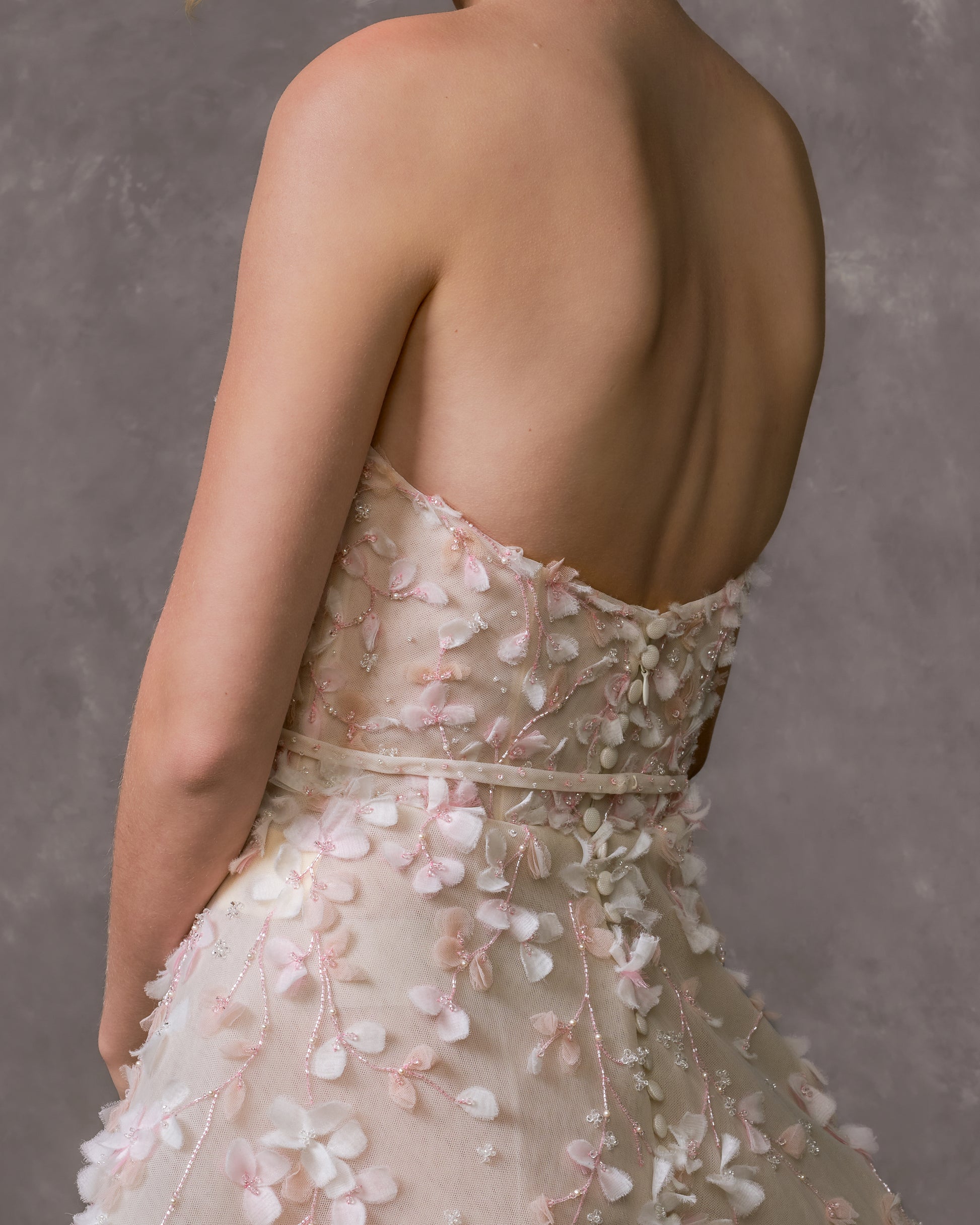 Petale captures the essence of spring in bloom. Crafted from airy layers of ivory tulle, the gown features a soft sweetheart neckline and a corset-style bodice that flatters with ease. Dimensional petals in blush and ivory are delicately scattered across the A-line silhouette, creating a sense of natural movement and texture. Feminine, expressive, and effortlessly romantic, Petale is a gown that blossoms with every step.